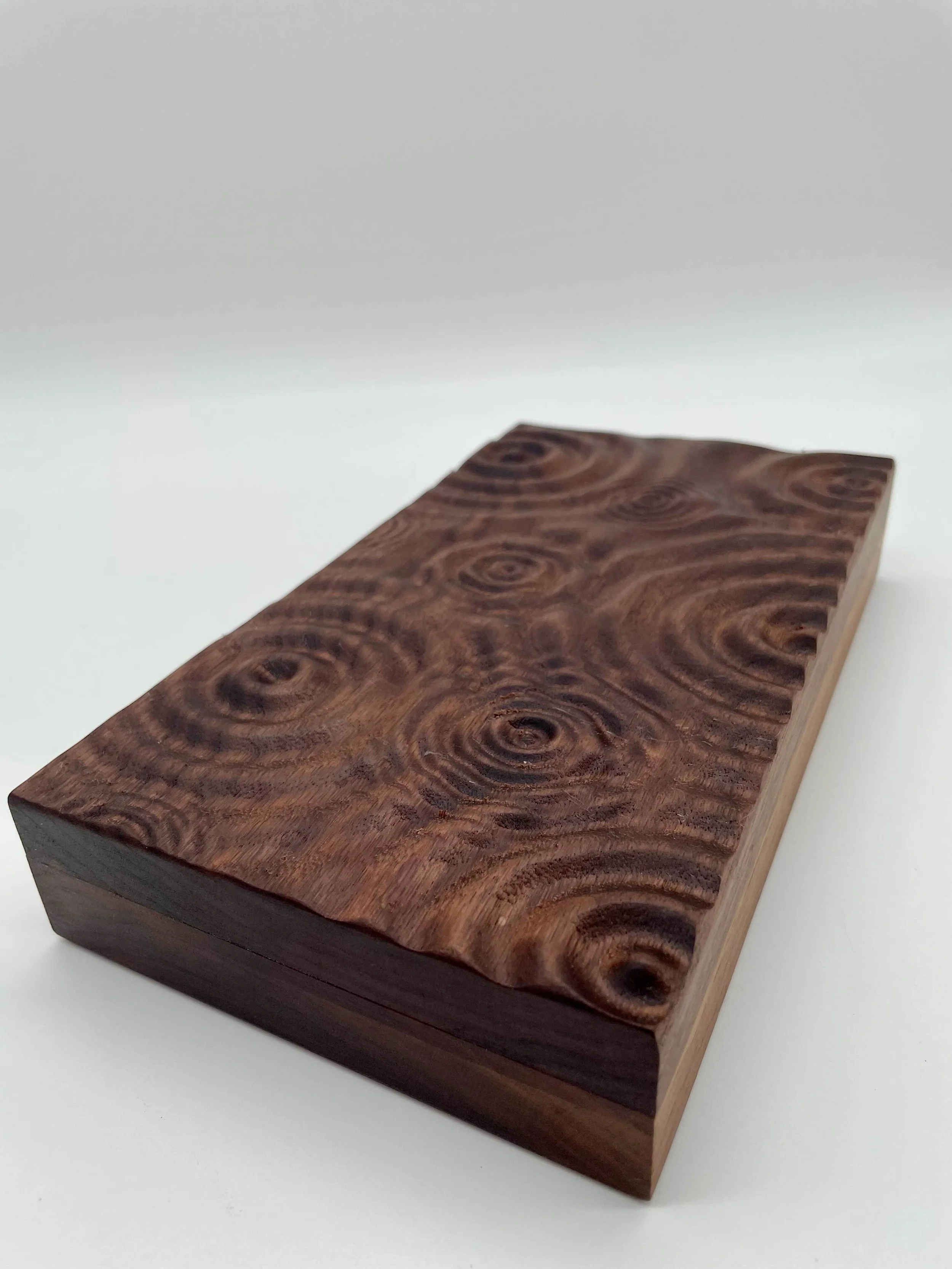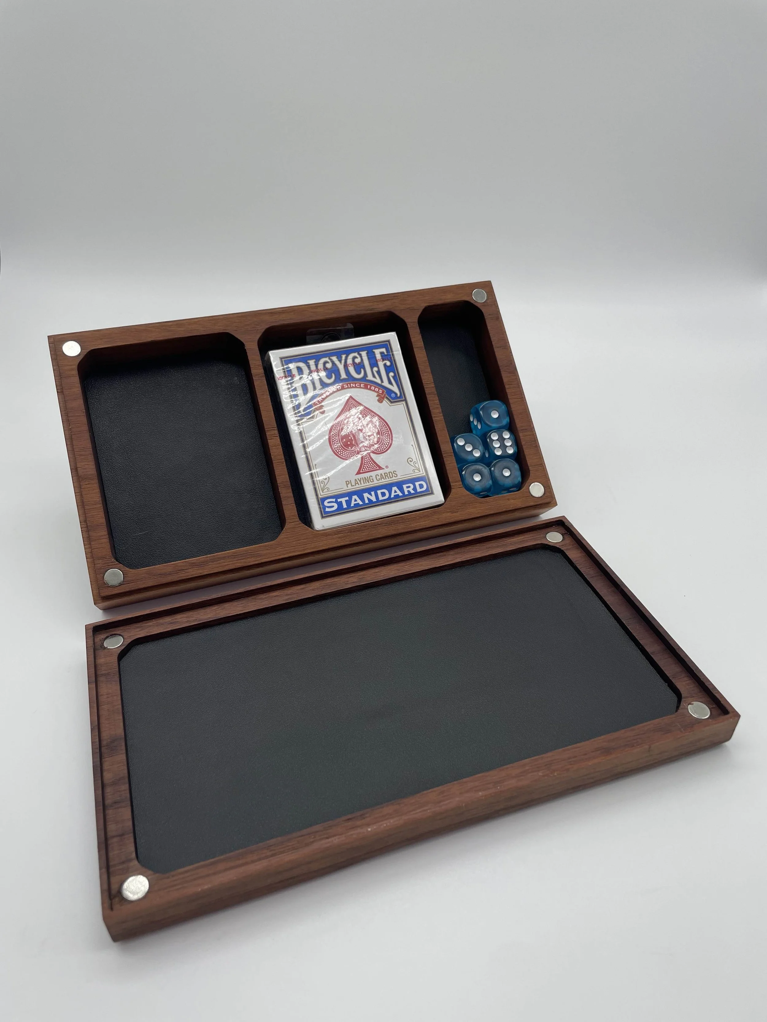 This is a rectangular box to encase your dice, writing implements, our promotional sept jails, a smartphone, or anything else you can imagine placing within the slots inside! Strong neodymium magnets are hand set in the lid, offering an ideal feeling of security. The finishing touch is two coats of hand-applied oil and wax buffed to a silky satin sheen.